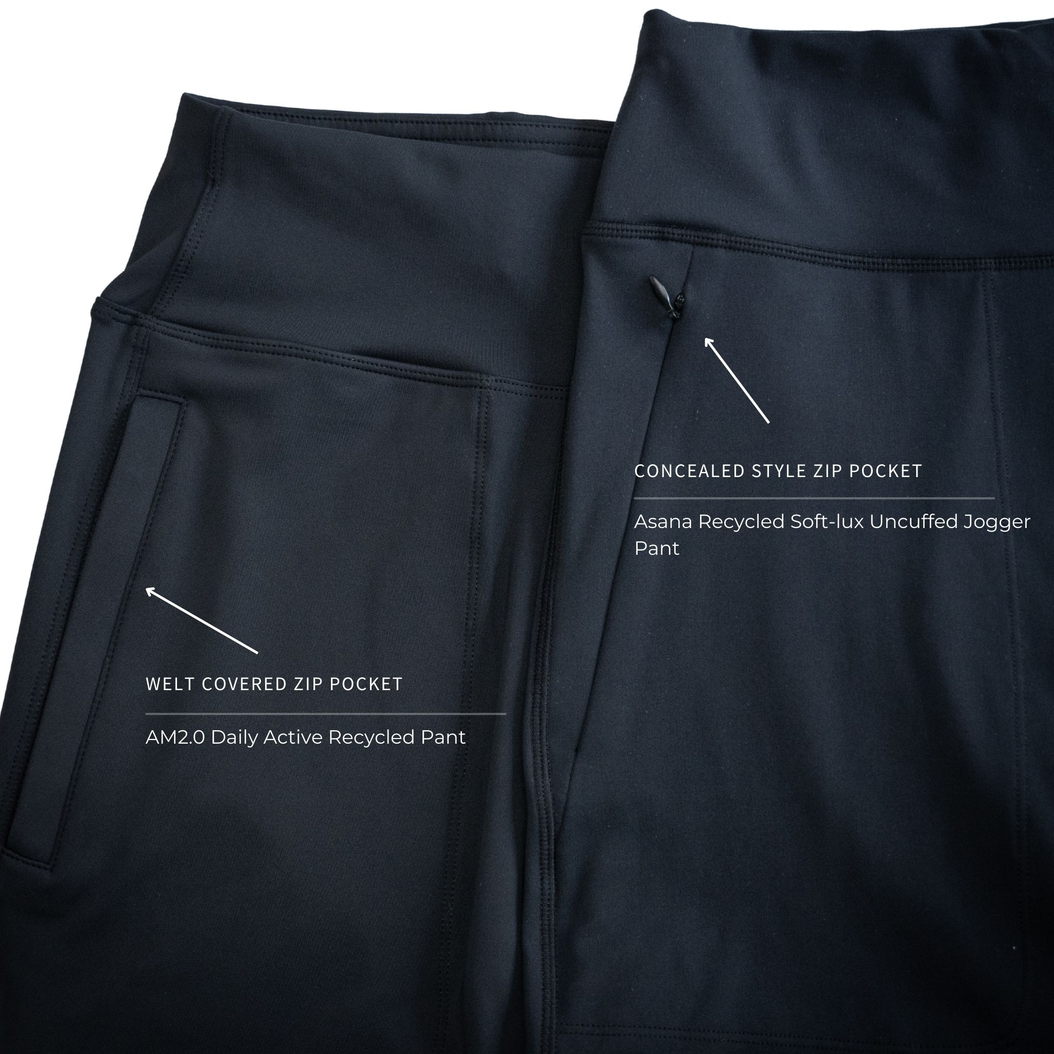 The AM2.0 pant is consructued with a welt cover style pocket whilst the Asana uncuffed jogger pant utilises a concealed zip pocket design that is the same as on the original Asana jogger.