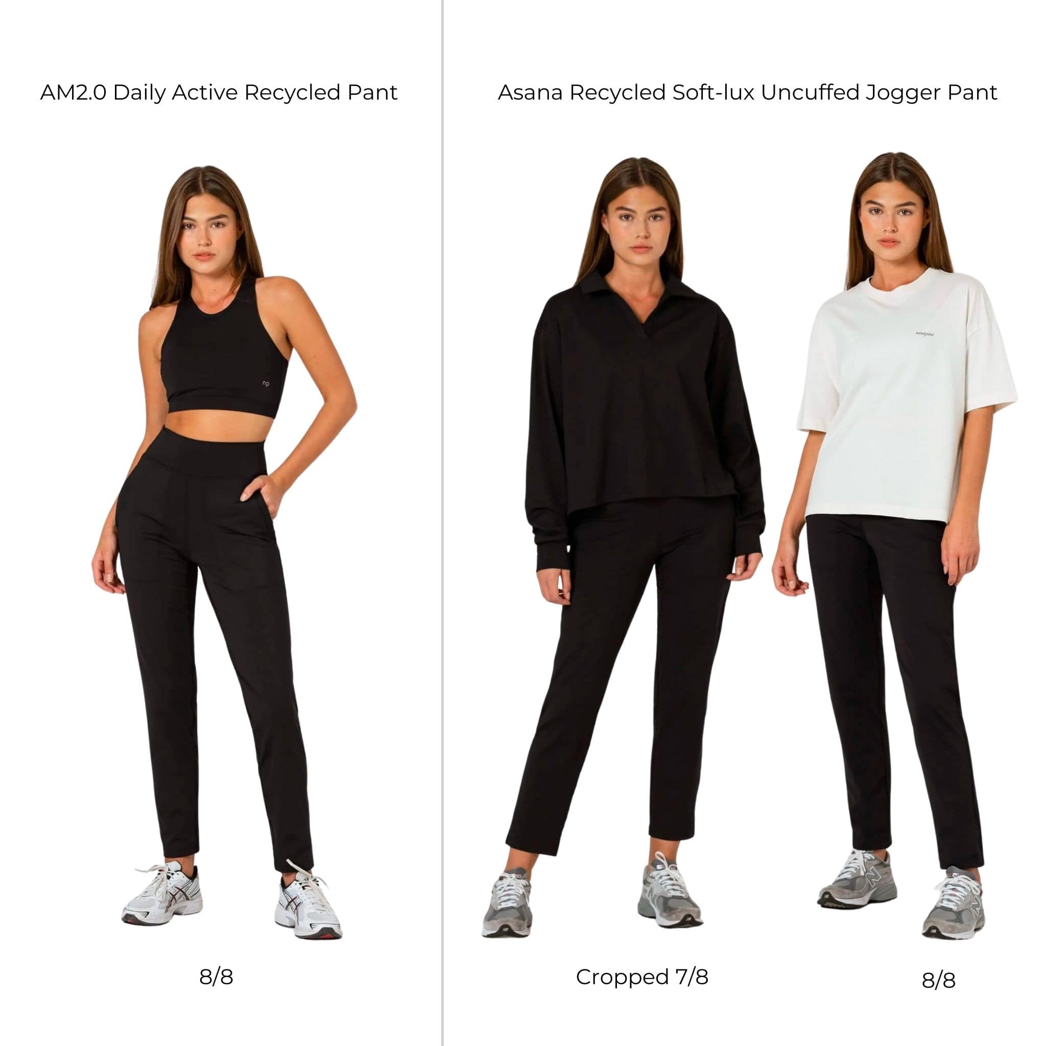 The AM2.0 pant has a slightly slimmer leg opening compared to the Asana uncuffed jogger pant.