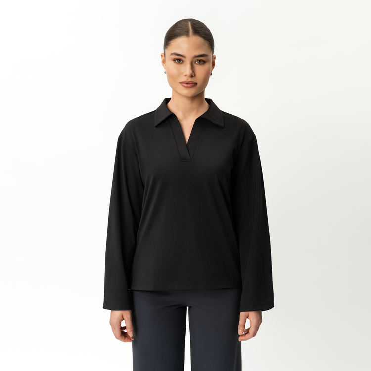 • Polo collar with open neckline for a modern, effortless look